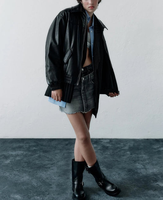 Ailegogo Streetwear Women Retro Loose Pu Faux Leather Jacket Spring Autumn Female Zipper Belt Coat Vintage Outwear