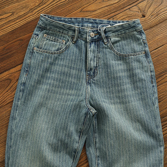 Heavy chunky jeans men vintage do old wash dark vertical texture of loose straight leg denim pants