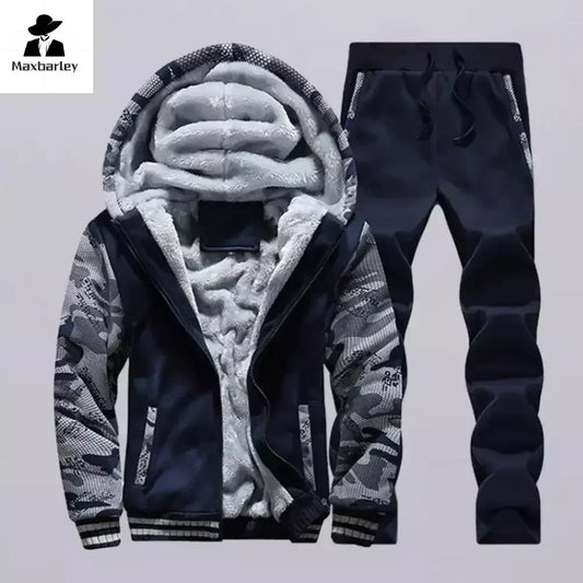 New Fleece Men Set Fashion Brand Tracksuit Lined Thick Sweatshirt + Pants Sportswear Suit Male Winter Warm Hooded Outerwear Suit