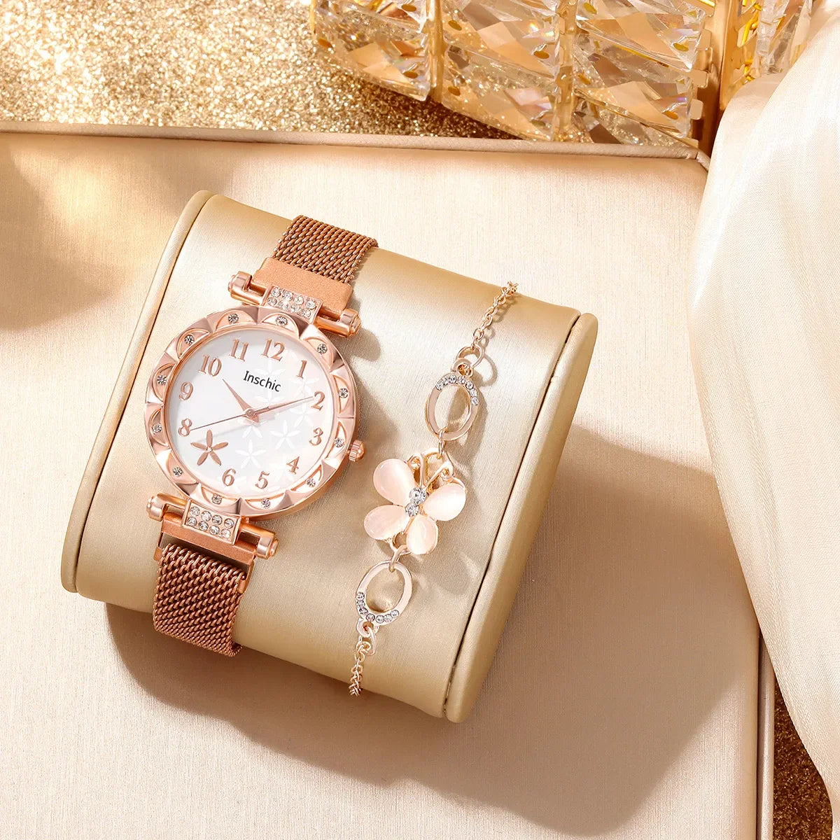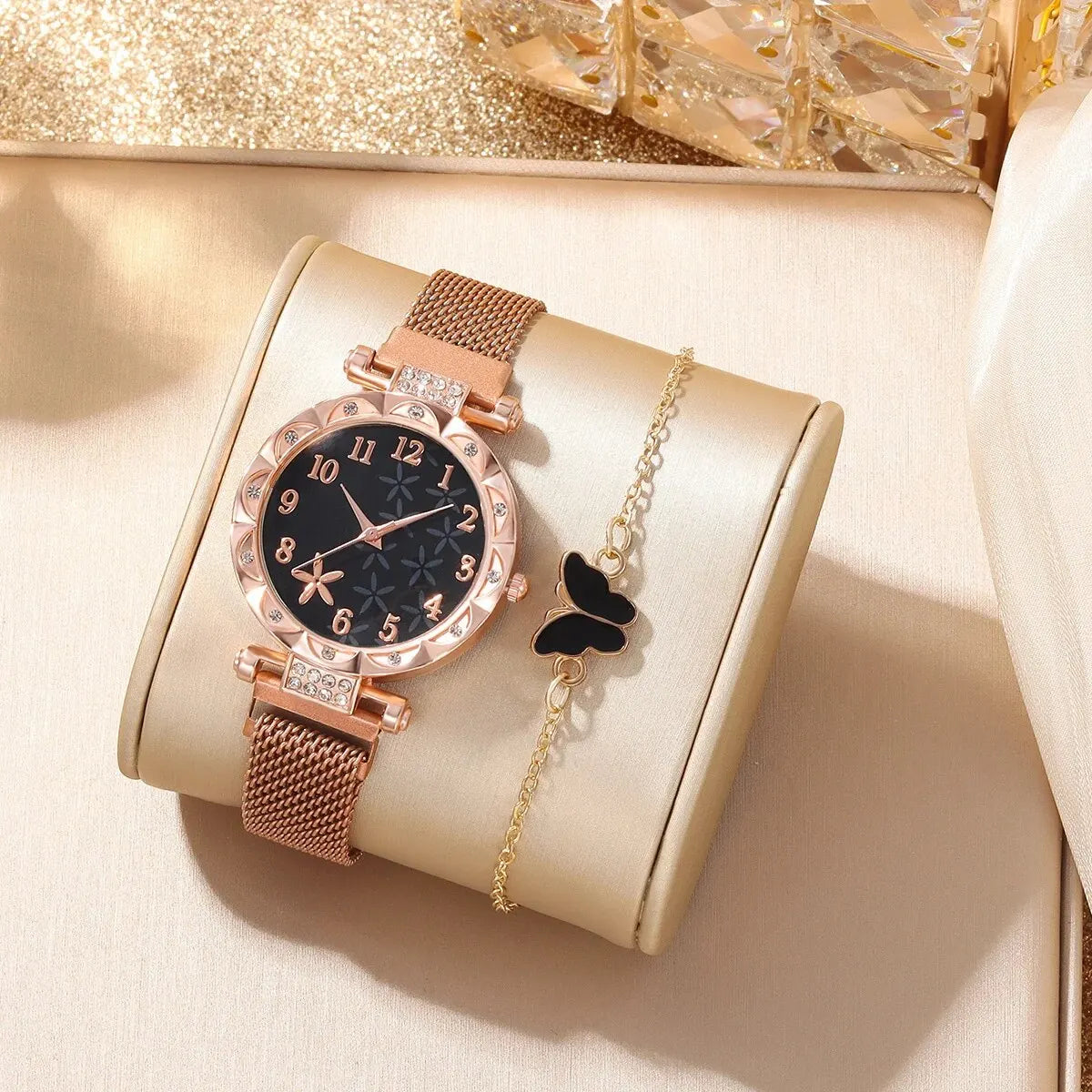 2 PCS New Women's Small Fresh Fashion Digital Rhinestone Star Quartz Watch Luxury Butterfly Jewelry Bracelet Birthday Gift Set