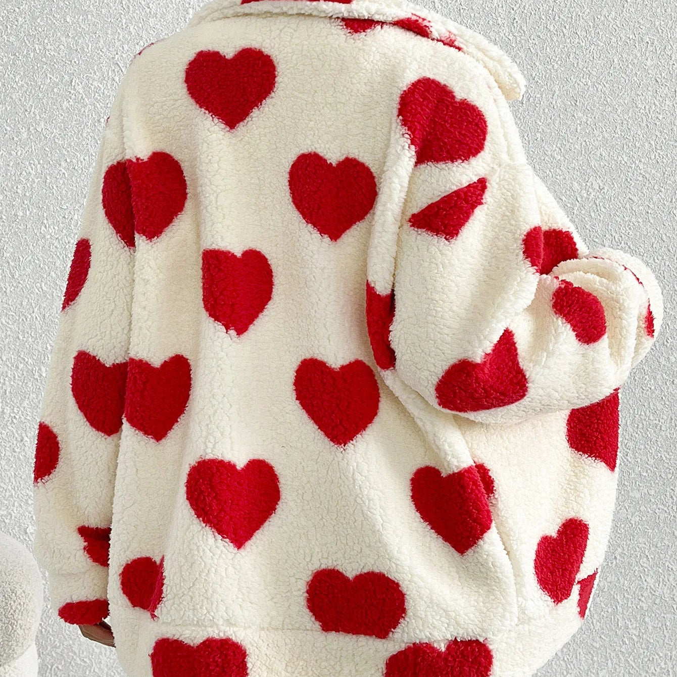 Playful yet cozy, the Amoura Heart Fleece Jacket blends warmth with soft statement detail. Designed in plush fleece with an all-over heart print, it features a zip-front closure and relaxed silhouette for easy layering. The long sleeves and comfortable fit make it ideal for cooler days, while the charming print adds personality to everyday styling. Pair with denim, leggings, or lounge sets for a look that feels warm and effortlessly put together.